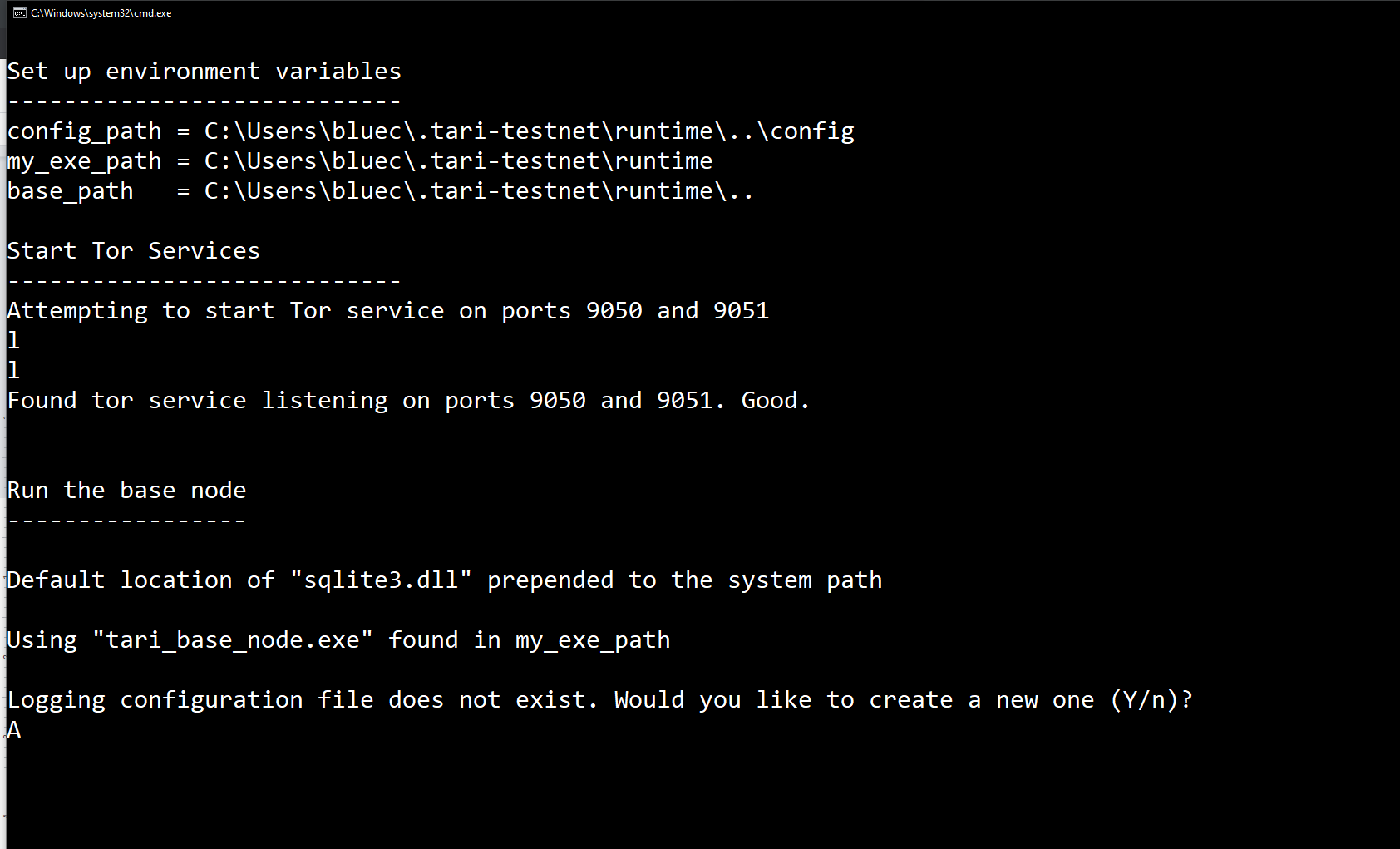 Inside of the ".tari-testnet" folder, there is a folder called "runtime". Inside of that folder, there is a batch file called "start_tari_basenode". Run it. You will soon be asked a question. "Logging configuration file does not exist. Would you like to create a new one (Y/n)?" Type Y and press enter.